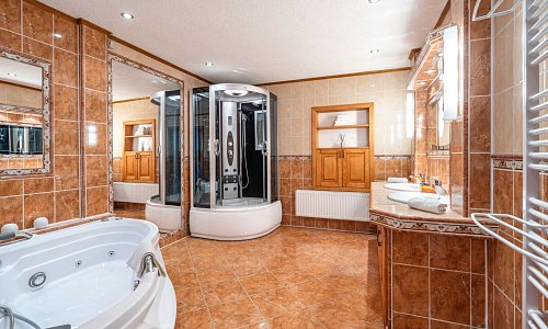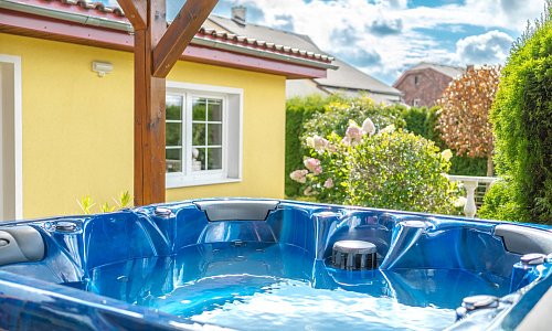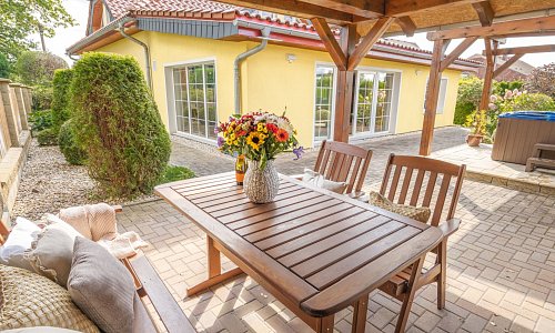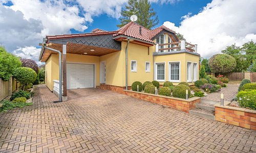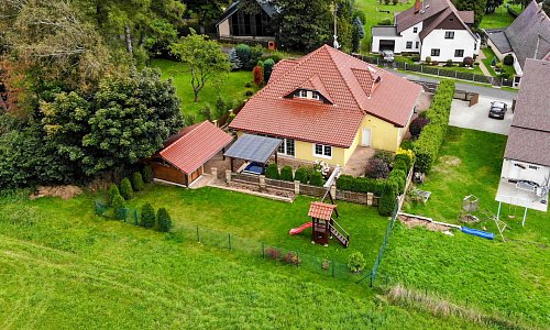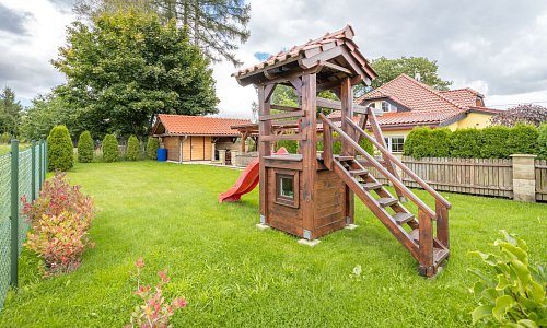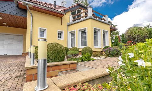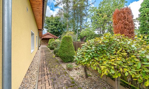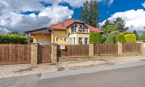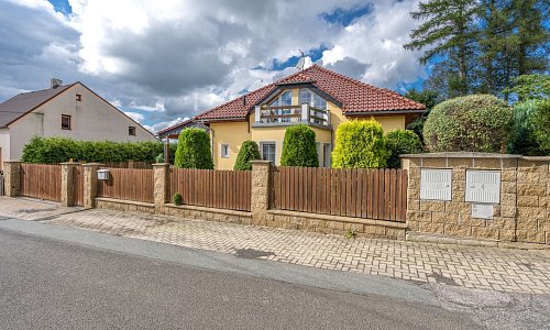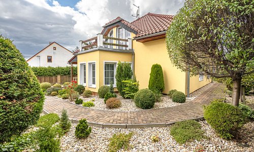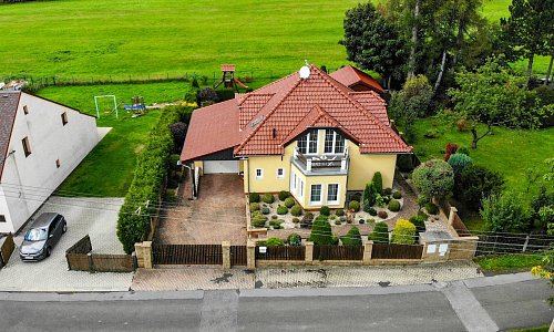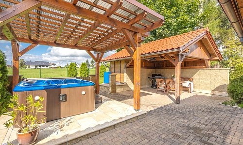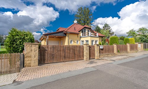 Dispozice - vstupní chodba se schodištěm, samostatné WC, koupelna, obývací pokoj spojený s kuchyní, zimní zahrada, pracovna. V patře najdeme další 3 místnosti, koupelnu a balkón. Vyjdeme-li z domu ven, dostaneme se ke garáži, dřevěné pergole s posezením, venkovní vířivce a dokonce i dětskému hřišti.
