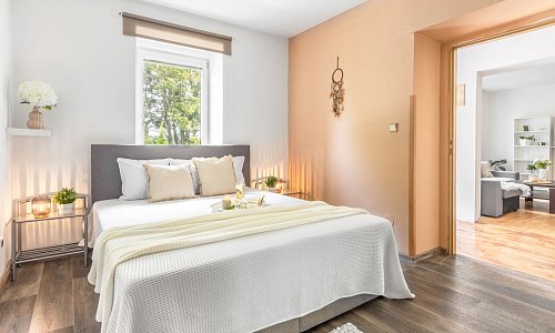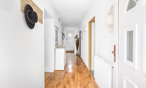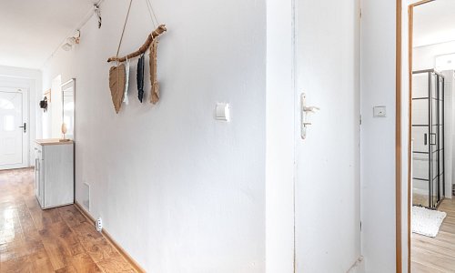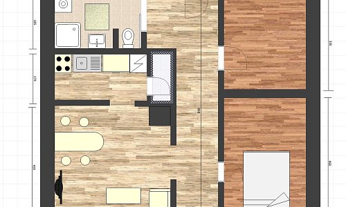 Dispozice: prostorná vstupní chodba, Na levé straně najdeme obývací pokoj, kuchyňský kout, koupelnu po rekonstrukci. Po pravé straně - ložnice, místnost (není vyfoceno - aktuálně skladiště).